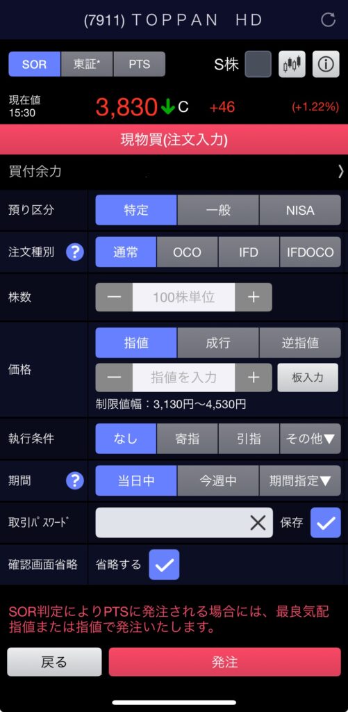 単元未満で購入する際は、右上のS株にチェックを入れましょう。そうすると、画面が少し変わります。単元未満株(S株)で購入すると、成り行き注文しかできず、翌営業日に取引されるといった制約があります。つまり、今日3,830だったとしても次の日以降の最初の取引で4,000だった場合、その値段で購入されることになります。