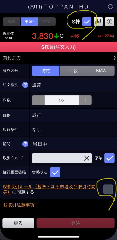 株のS株取引ルールに、上記で述べた詳細な内容を確認できます。確認したら、下部の同意するにチェックを入れると注文をすることができます。