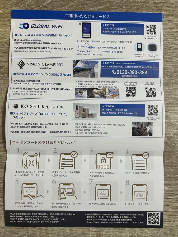 「優待券って、実際に使う時って面倒じゃないの?」と思う方もいるかもしれません!ご安心ください!ビジョンの優待はとってもスマートで使いやすいんです!こんな感じのが届きました。